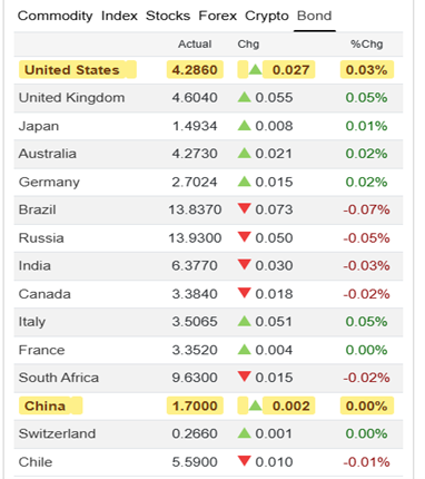 o The table below shows the 10-year government bond yield. As you can see, the US government is borrowing from its creditors at 4.28%, higher than Ghana or Bolivia’s BRI project funding